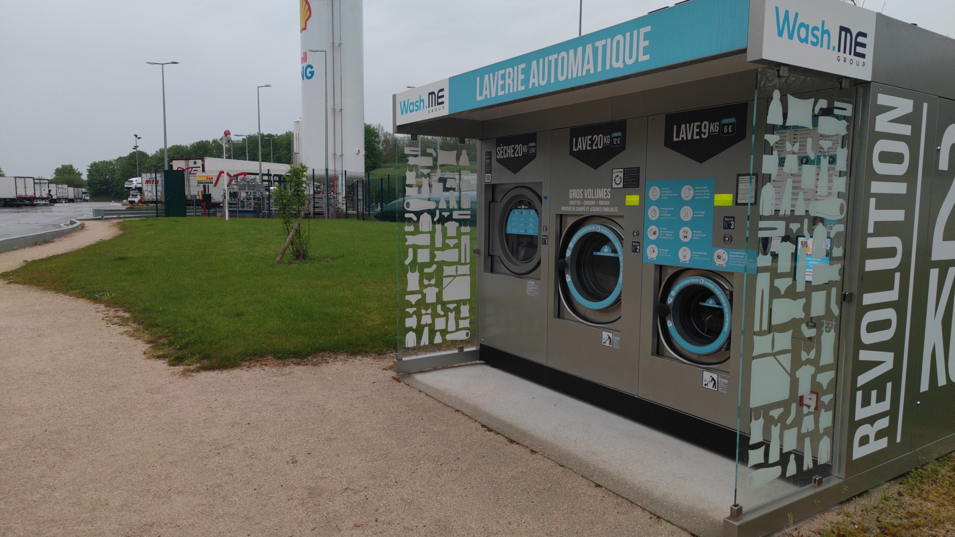 Grand stationnement. Douches et machines à laver. Tous les nouveaux. Le paiement du lave-linge s'effectue par carte ou en espèces. 6€