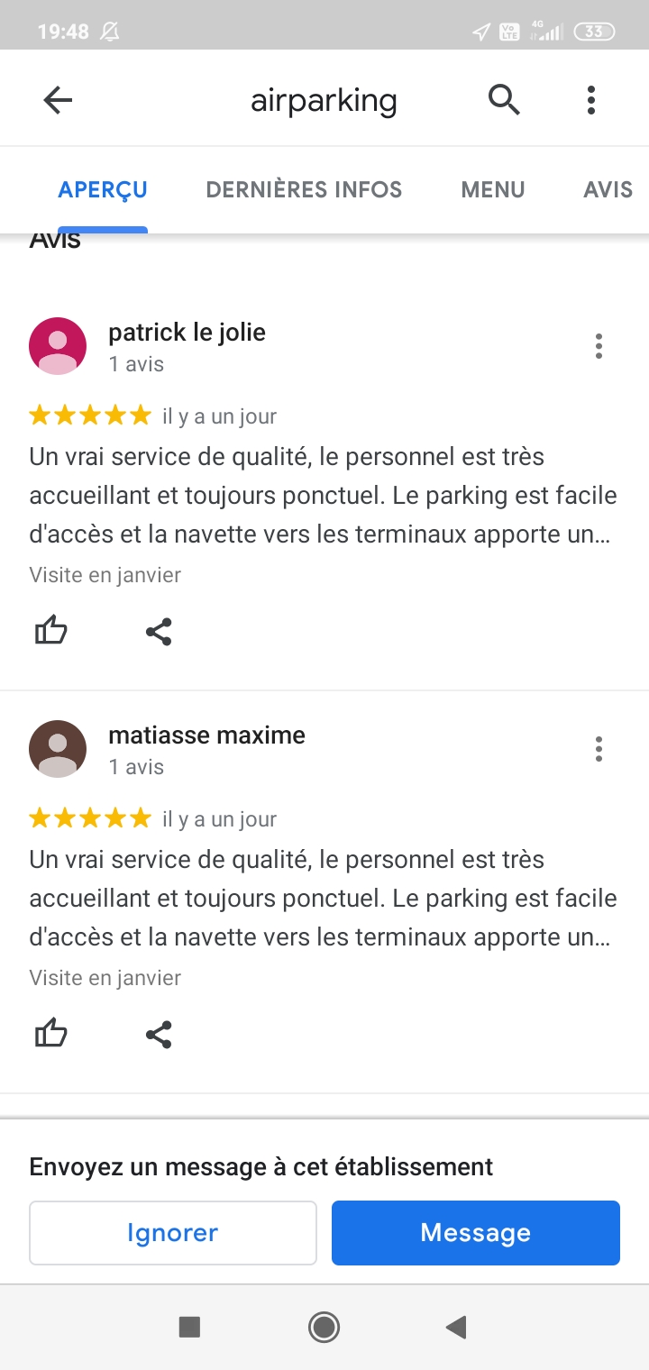 Voilà un concept curieux... Il y a une semaine, je réserve un créneau au parking pour demain matin en vue d'un départ à l'aéroport de Beauvais, avec pour souci une organisation sereine. Mais voici que ce soir, je reçois un mail stipulant que la réservation est annulée car l'entreprise n'est pas en mesure de valider ma réservation par manque de place. Quel intérêt de proposer un système de réservation si vous ne le respectez pas ? Cela fait sens pour vous de laisser croire à des gens qu'ils ont pris les bonnes dispositions pour leur voyage avant de les laisser dans une situation délicate la veille d'un départ ? Résultat : j'ai du réserver une place en catastrophe au parking de l'aéroport, en dépit de mes convictions pour défendre le commerce local. Coût de l'opération, plus du double du prix proposé par Air Parking, un stress accumulé la veille du départ et une gestion en catastrophe d'une situation ubuesque. Bref, je me suis fait bien avoir En bon commerçant, la moindre des choses serait de me rembourser la différence du parking souscris dans l'urgence, à moins que vous n'en soyez pas en mesure par manque de professionnalisme.