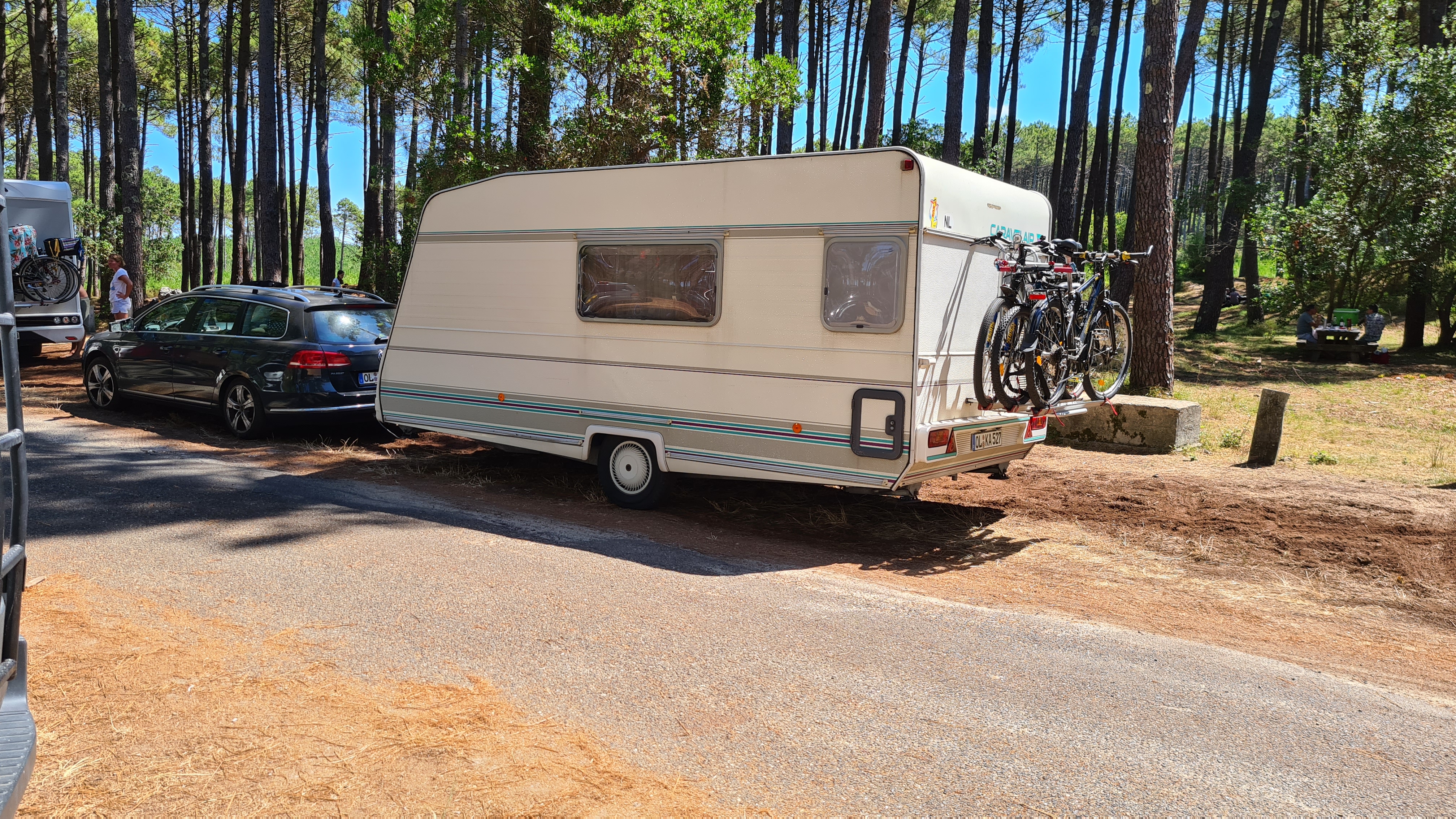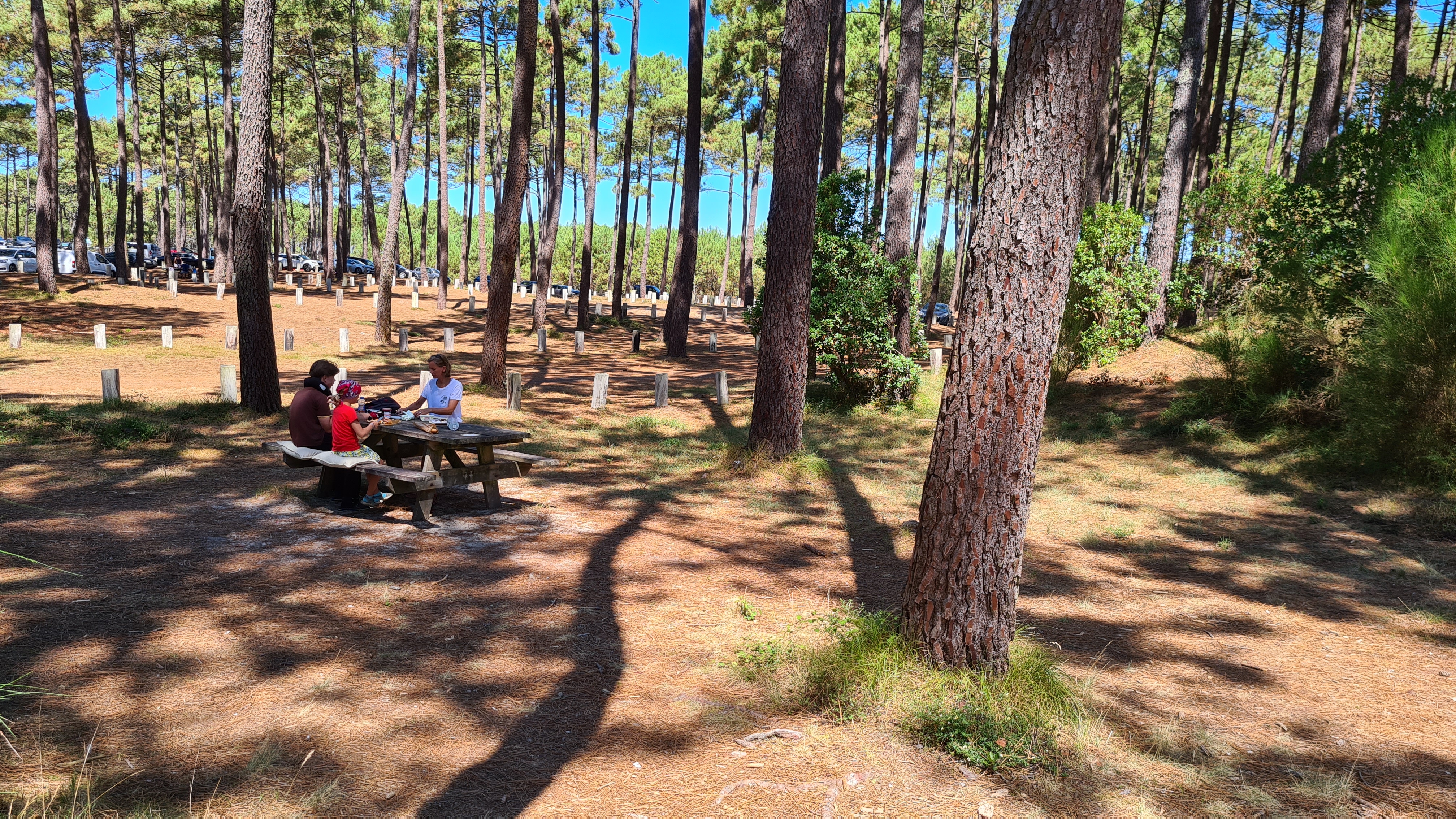 Grand parking au milieu de la pinède et proche de la mer. Si vous conduisez avec une remorque, commencez par la zone médiane et espérez qu'il n'y ait pas trop de camping-cars occupant la bande longitudinale. De nombreux bancs et tables invitent à pique-niquer, même si beaucoup se sont également dispersés dans leur camping-car et prennent ainsi de la place. Je ne comprends pas comment on peut se plaindre de ne pas pouvoir y passer la nuit. Il y en a partout. C'est un parking, et quel parking c'est.