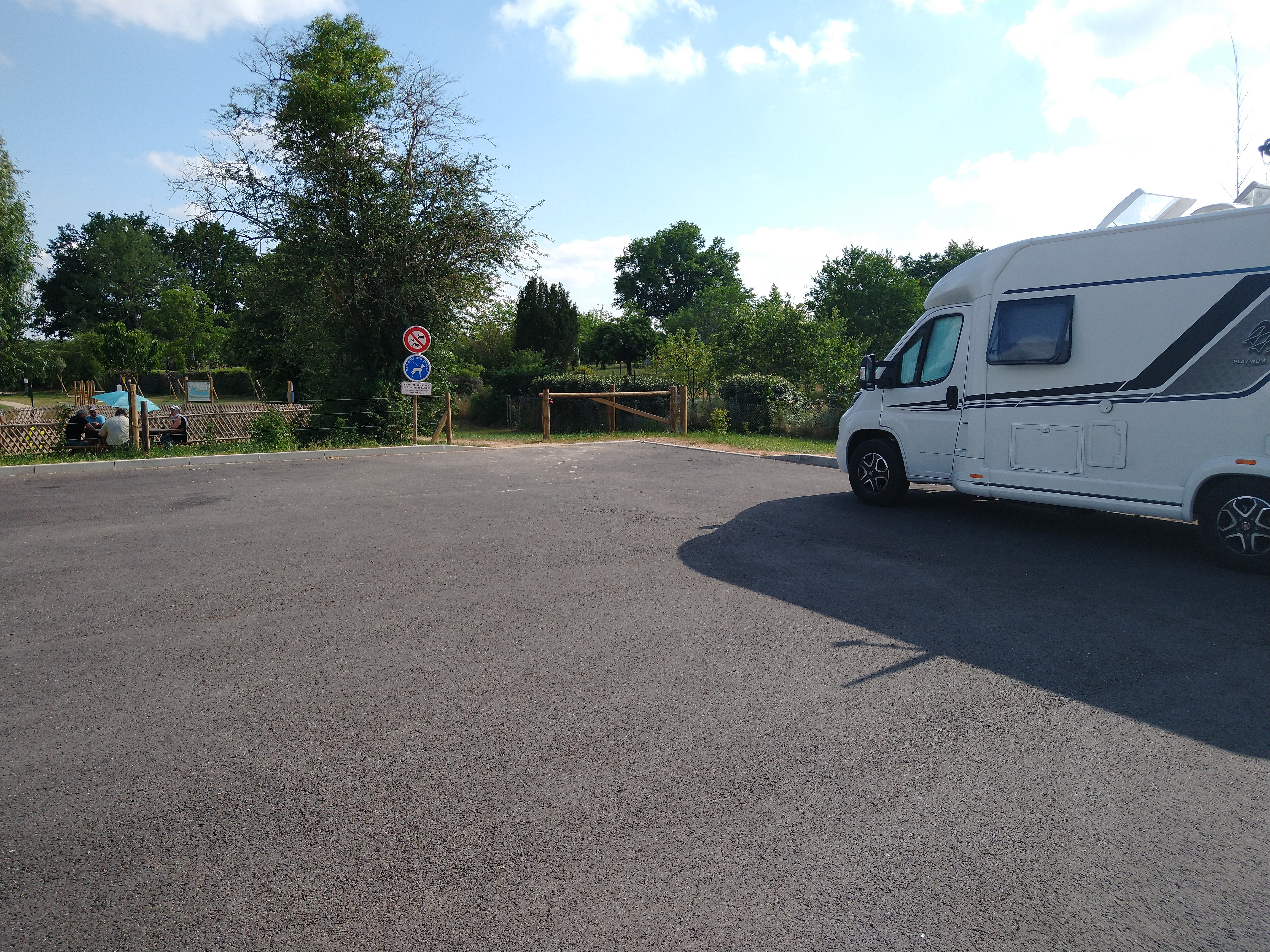 Aire parfaite , les services sont ouverts et très fonctionnels et surtout très propres , prenons en soin. Le lieu est en bitume ,plat . L, environnement est calme et lieu de promenade au bord de l' Étang.