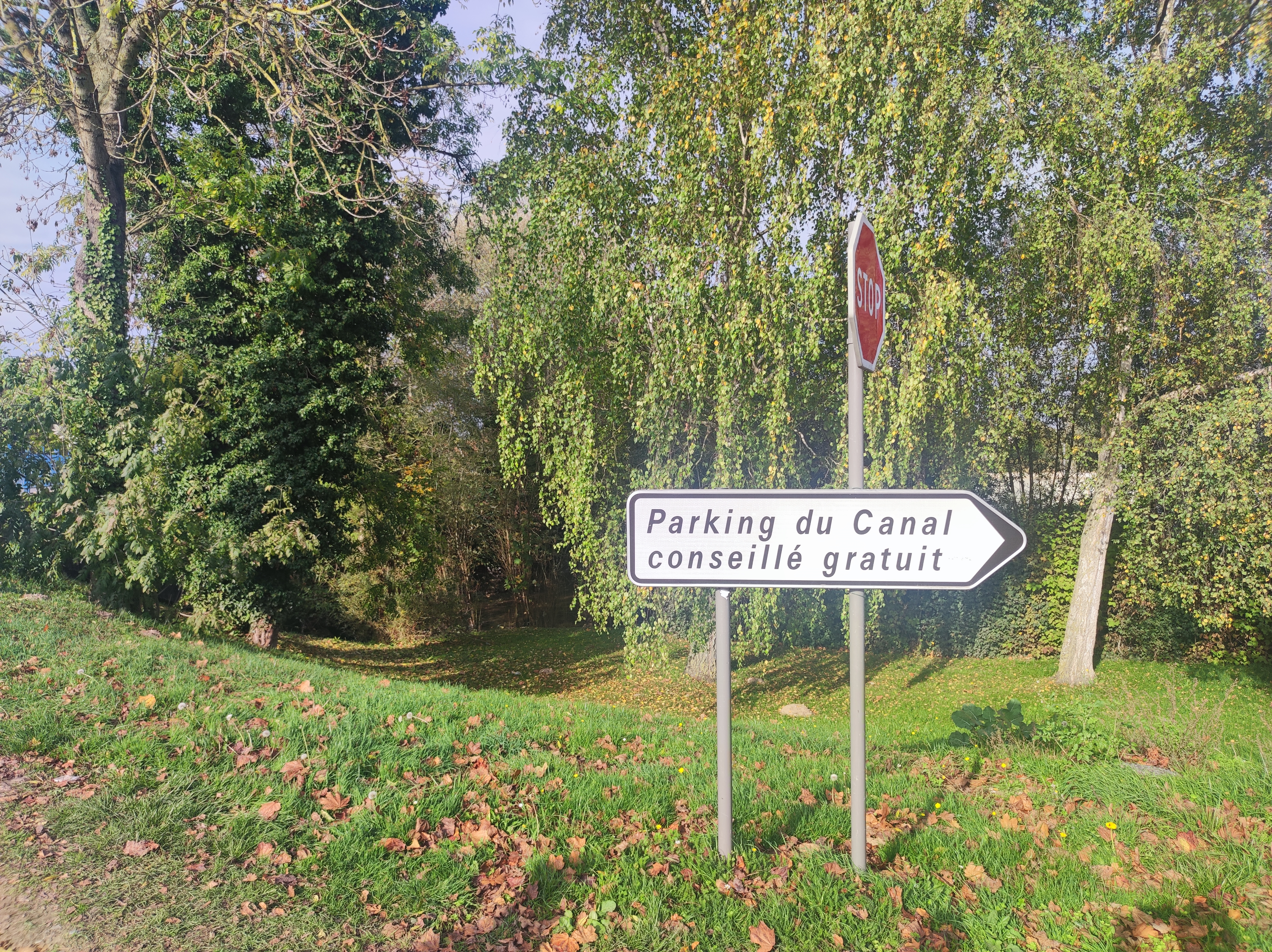 Parking public gratuit accès à la ville très facile en longeant le canal.
