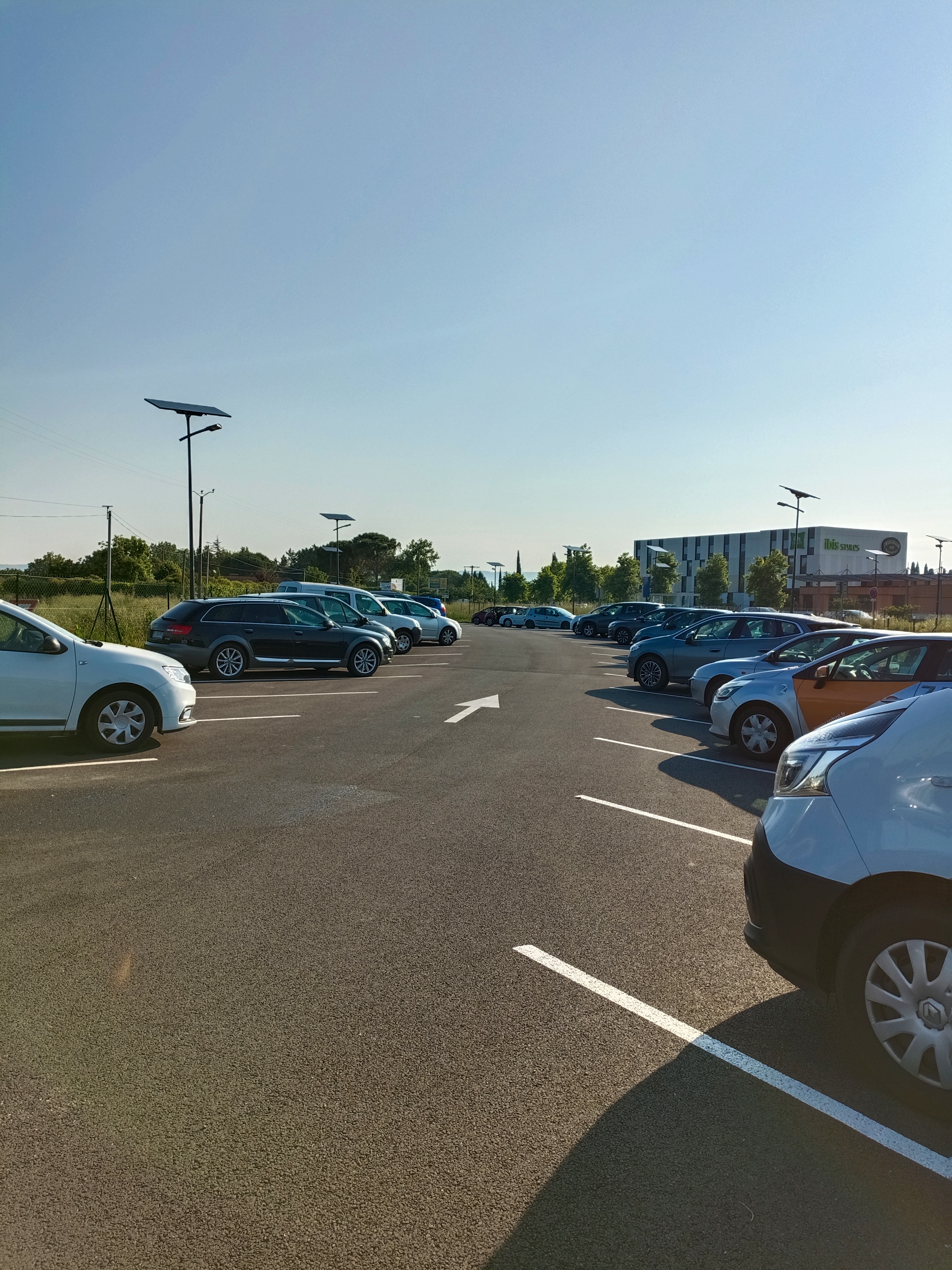 Accès très facile sur rond point après la sortie où l entrée d autoroute. Nombreuses places en épi et assez larges Il y a un arrêt de bus, et en face de quelques magasins et hôtels. Il manque juste quelques poubelles...