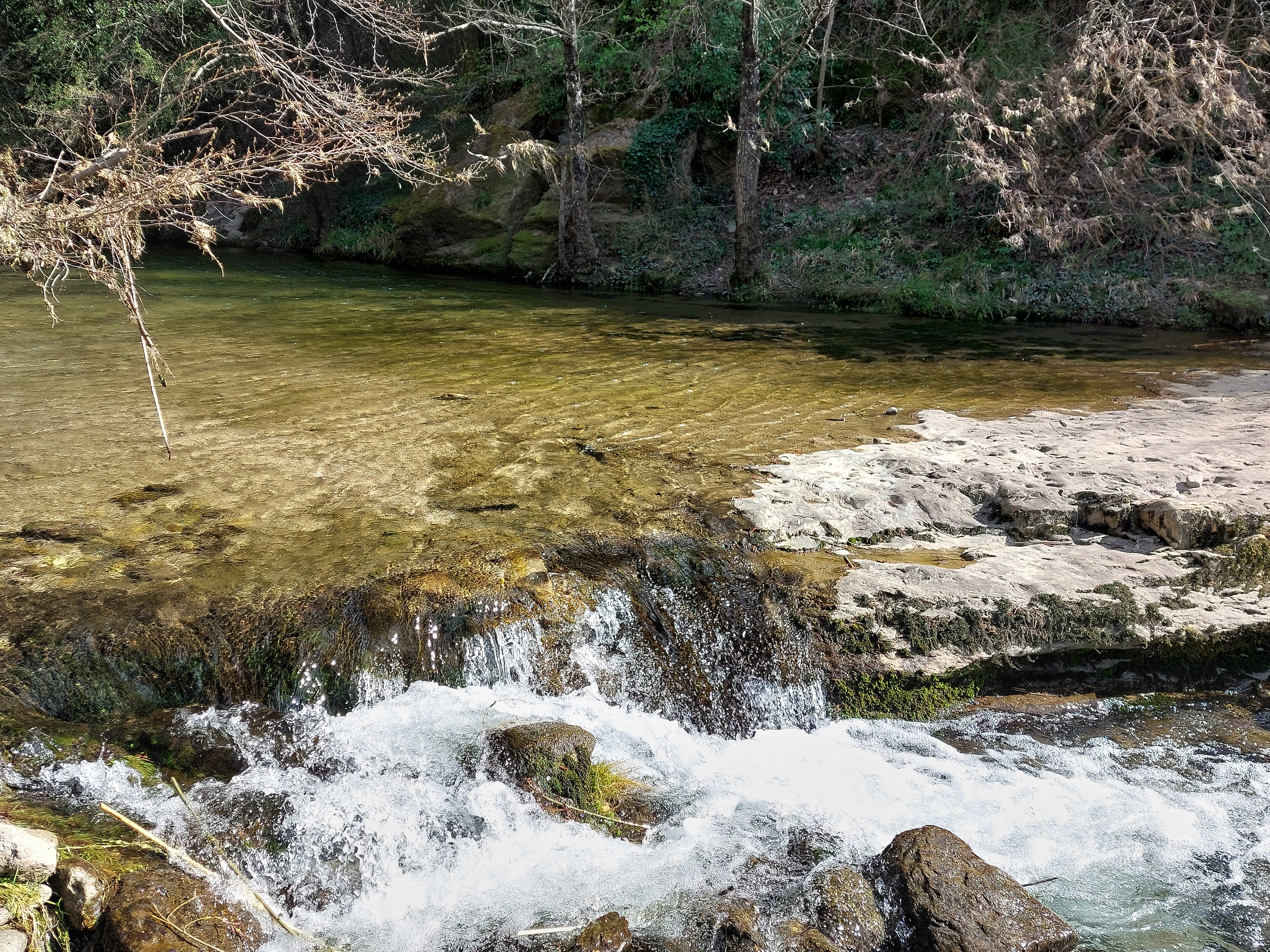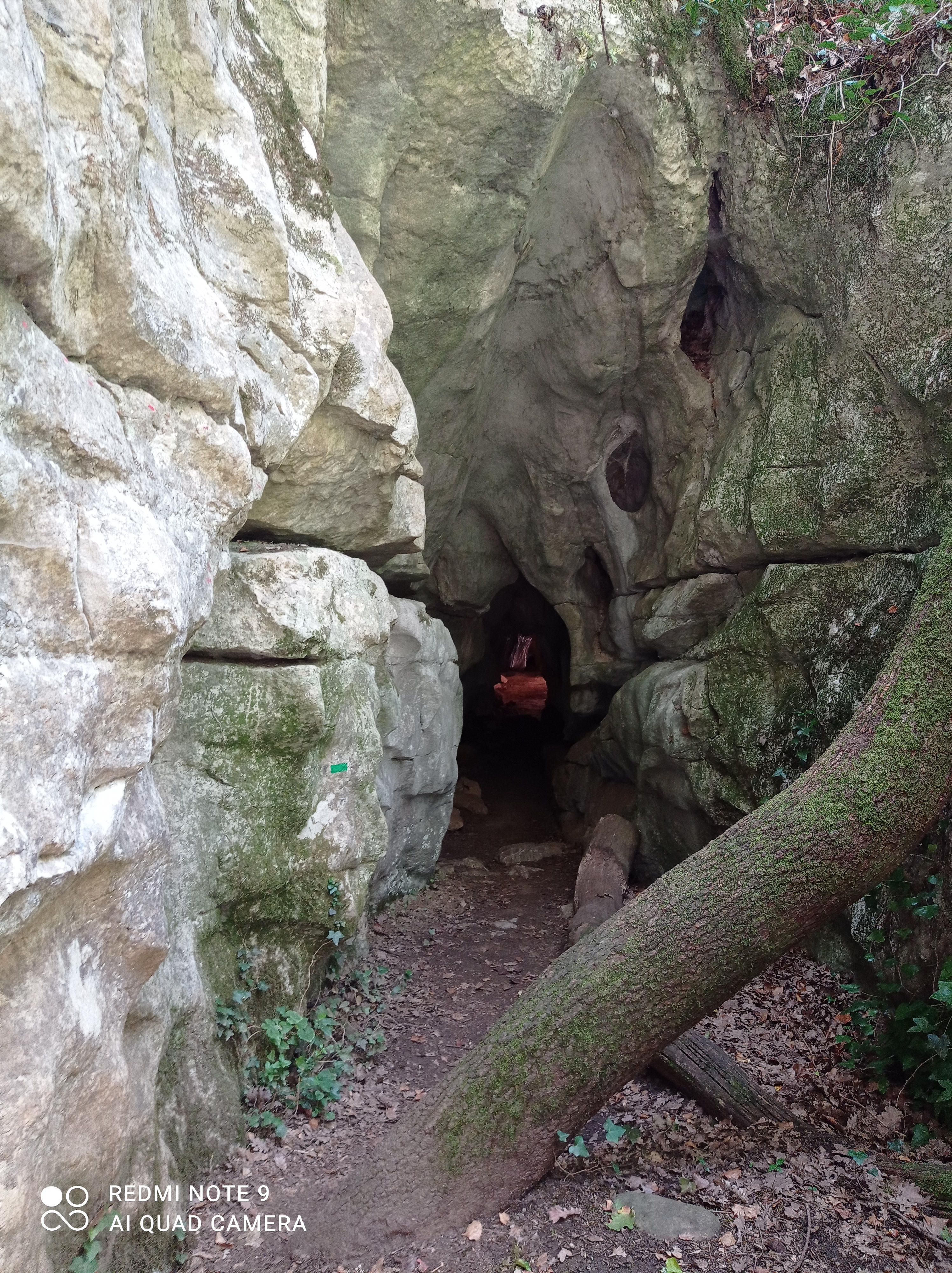 Trois promenades bien balisées partent de ce parking. Nous avons parcouru l'itinéraire B en combinaison avec D (B dans le sens inverse des aiguilles d'une montre, vers la fin D est ajouté et vous pouvez ensuite le suivre, voir photo avec la carte). Tout au long du parcours, vous rencontrerez des rochers d'escalade et un certain nombre de grottes et de cavernes. Vous pouvez également nager dans la rivière. Les enfants (5,7,11) ont adoré. Cela nous a pris environ 4 heures, y compris la natation et beaucoup d'escalade.