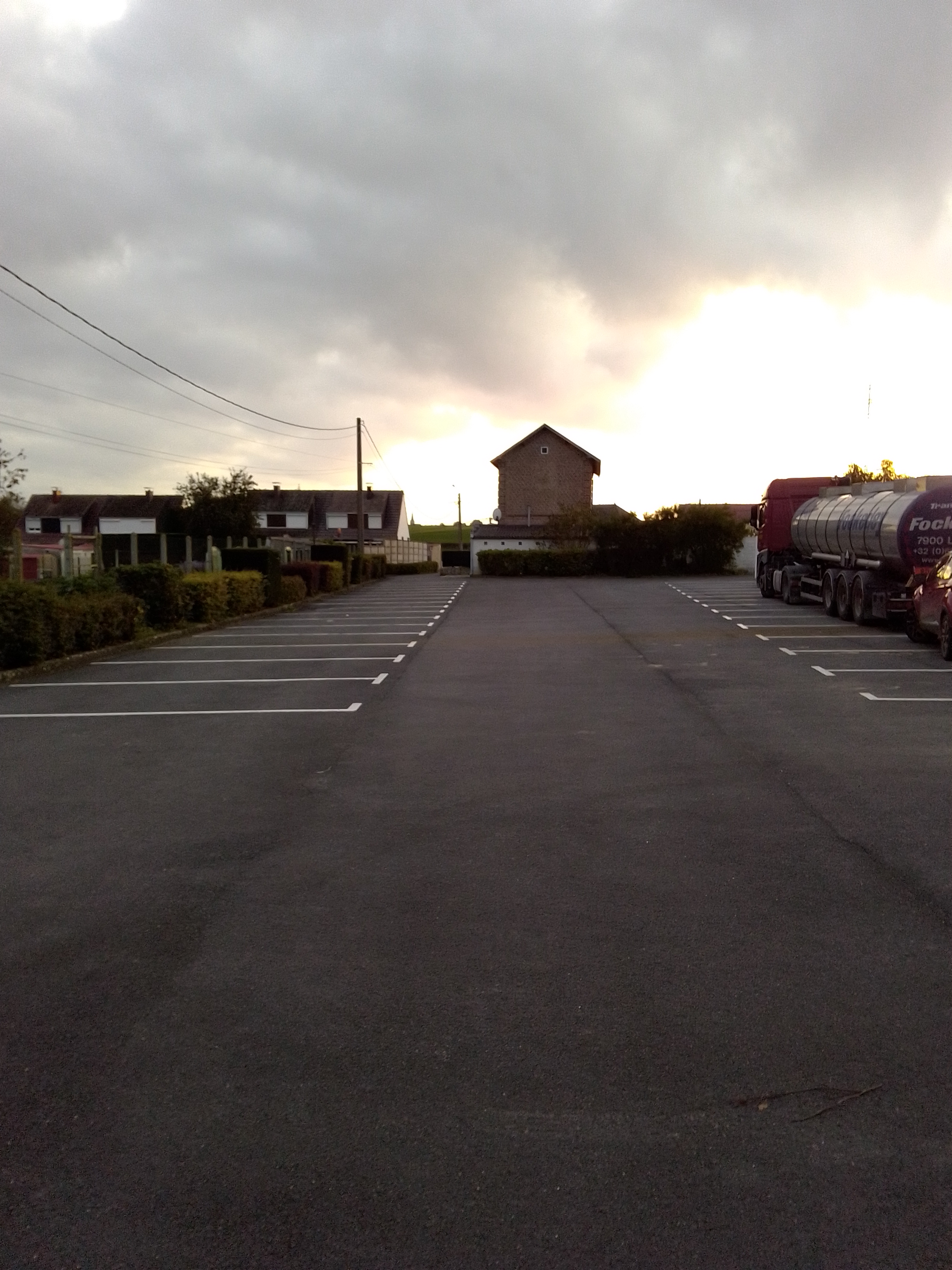 Situé à côté du cimetière, ce parking comporte des places pour les voitures et de places handicapés. Il y a un banc, une benne pour la collecte des vêtements, puis après un rétrécissement le parking se prolonge. Il y a à cet endroit un camion en stationnement. Ce parking dispose d'une deuxième entrée plus petite. Pour sortir il faut faire attention car les deux entrées sont à double sens.