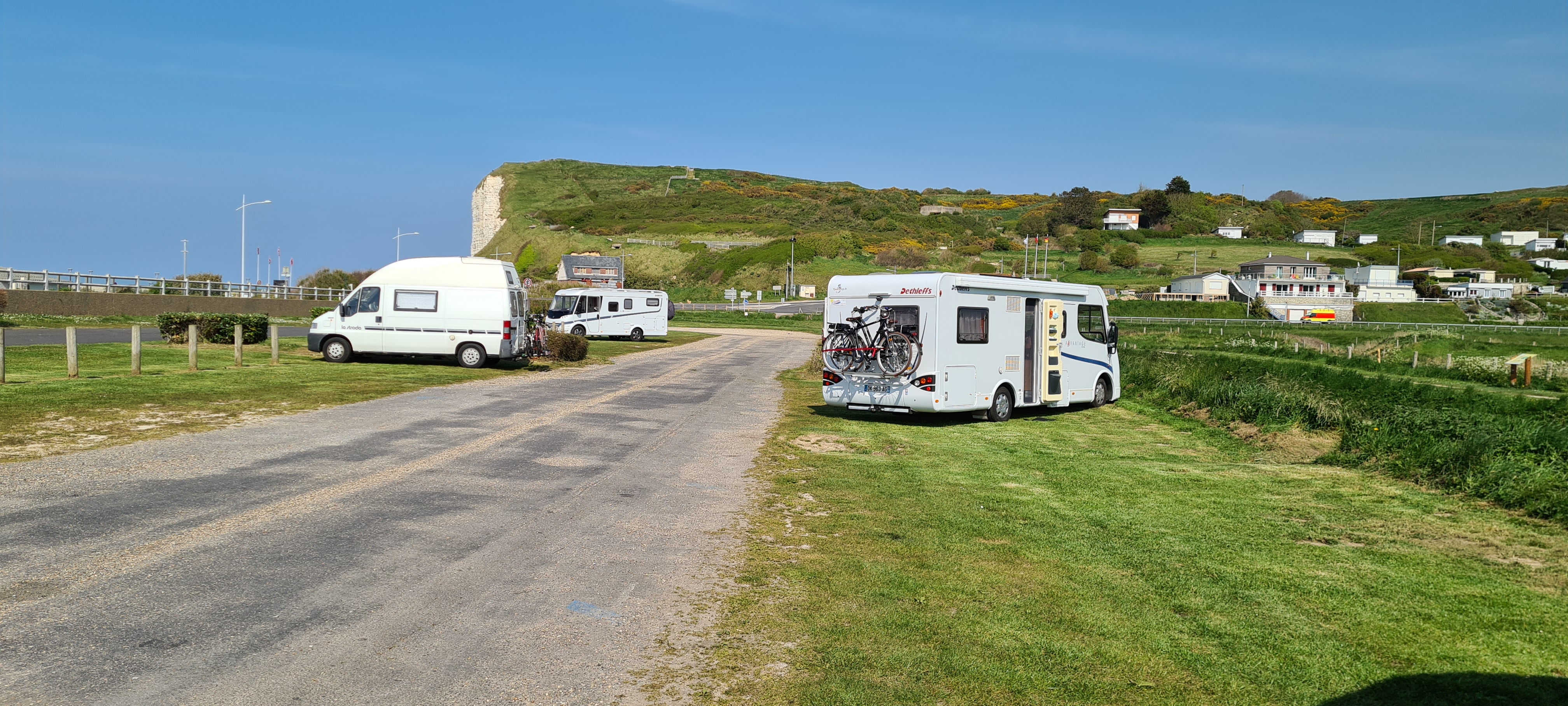 Parking d un côté pour les voitures de l autre pour les campings cars. 7 € la nuit + 0.40 cts par personne de taxe de séjour. 3.50 € les services Vue d un côté sur mer de l autre les prairies sous paluel ou se niche la durdent...