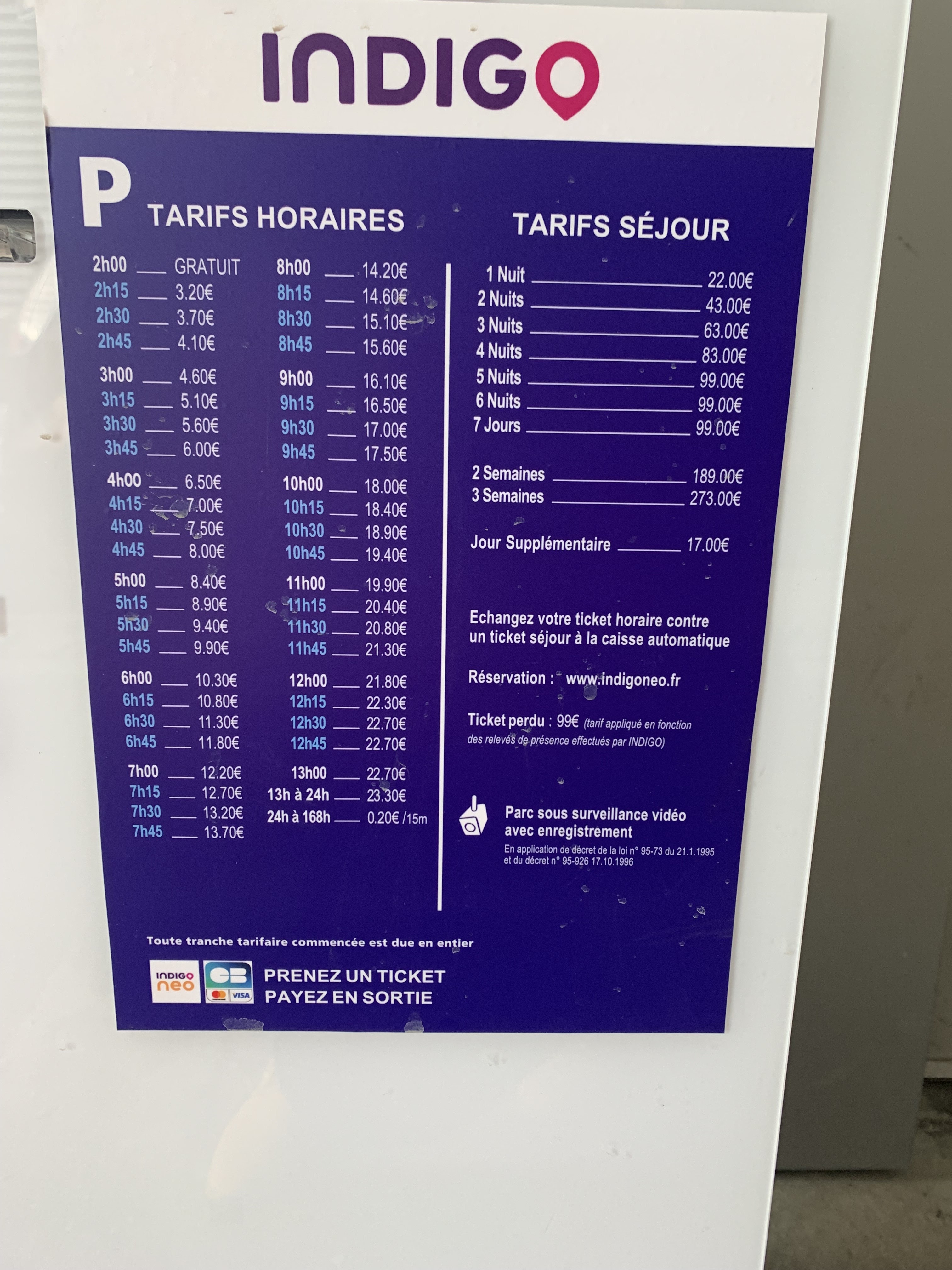 Pratique trompeuse ! Le prix de 99€ annoncé pour la semaine est bien Affiché en Gros! Mais pas le petit texte comme quoi il faut que vous retournez à la borne sous 24h pour transformer votre ticket ! Indiquer en petit qu'après 24h de stationnement vous payez en plus 20 centimes par quart d'heure je vous laisse a faire vos calculs 80 centimes de l'heure X 24h multipliez par le nombres de jours que vous restez ... Bref , mention spécial a Indigo ... Pratique trompeuse